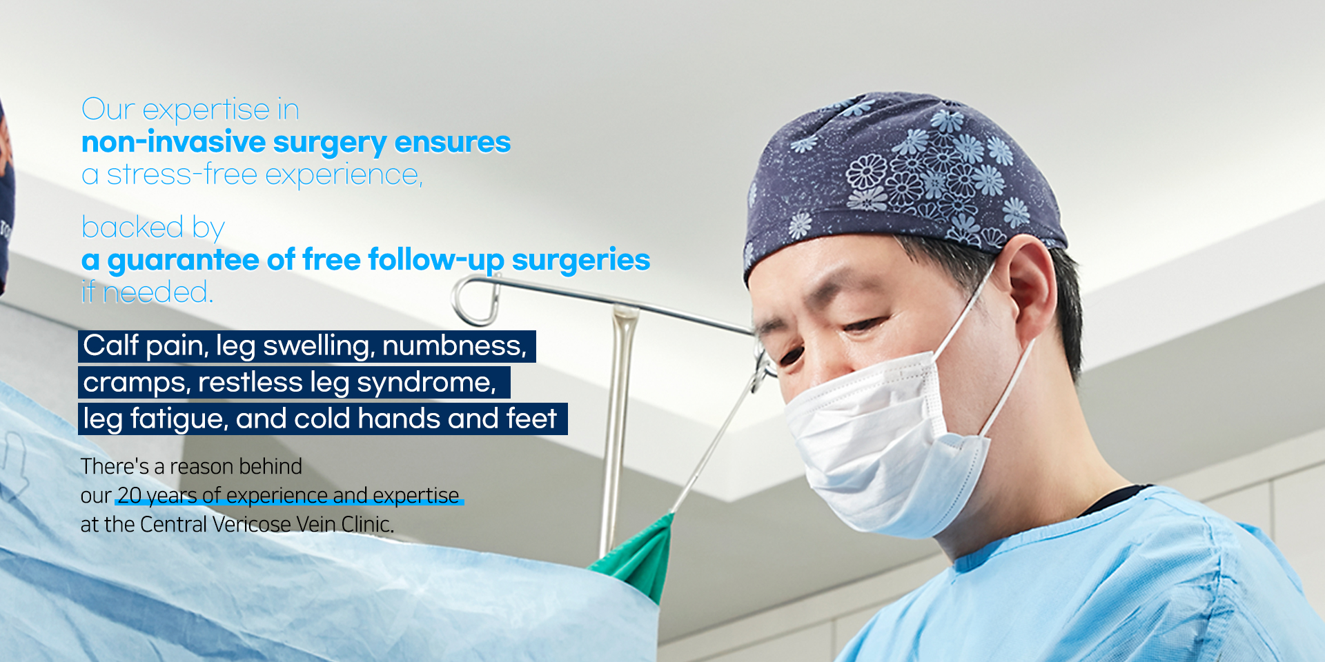 Central Varicose Veins Clinic does not use sedation or general anesthesia. All surgeries are performed safely using semi-sedation and local anesthesia..